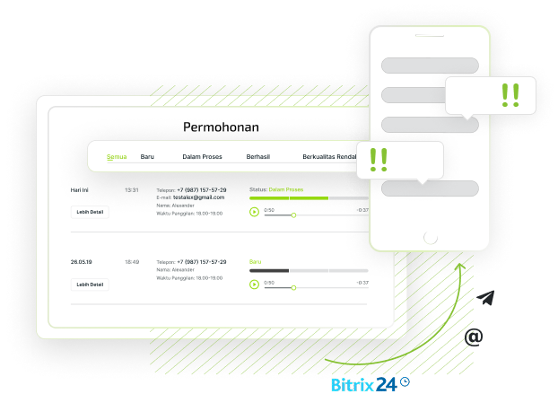 Sistem ini memudahkan Anda dalam mengelola dan mengategorikan permintaan dari seluruh form dan situs web. Semua permintaan masuk ke dalam CRM secara langsung, dan operator yang ditunjuk akan menangani permintaan tersebut, mengubah status, serta menyediakan catatan komentar untuk tiap pelanggan