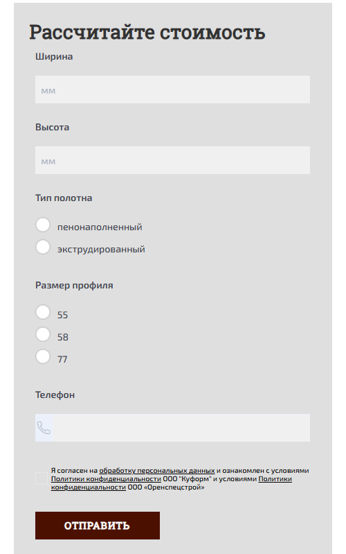 Ini bukan kalkulator online, tetapi formulir sederhana di mana klien memilih karakteristik yang diperlukan: dimensi, jenis bahan, opsi tambahan, dan mengirimkannya ke manajer untuk perhitungan yang akurat.