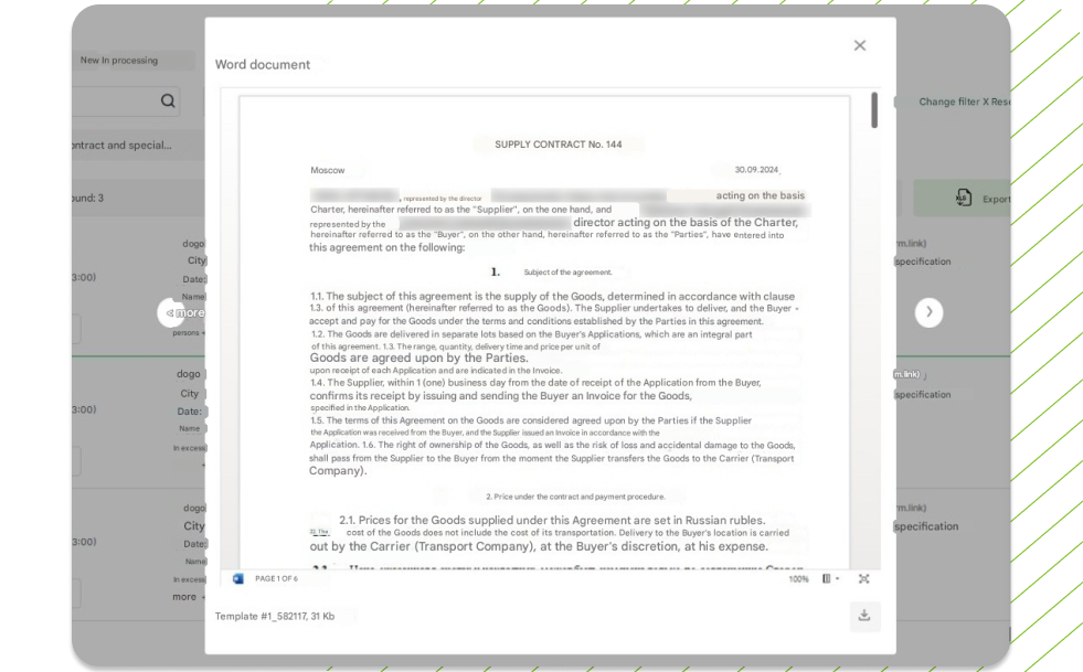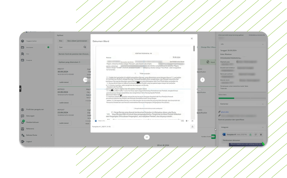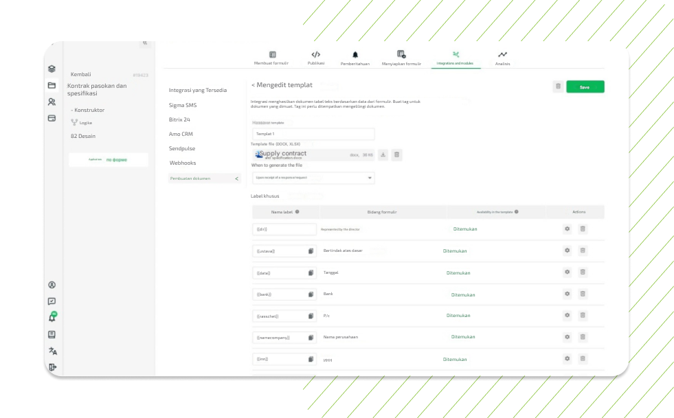 Pembuatan faktur, kontrak, dan tindakan otomatis berdasarkan data dari formulir. Unggah templat dokumen dan konfigurasikan logika pengisian label khusus