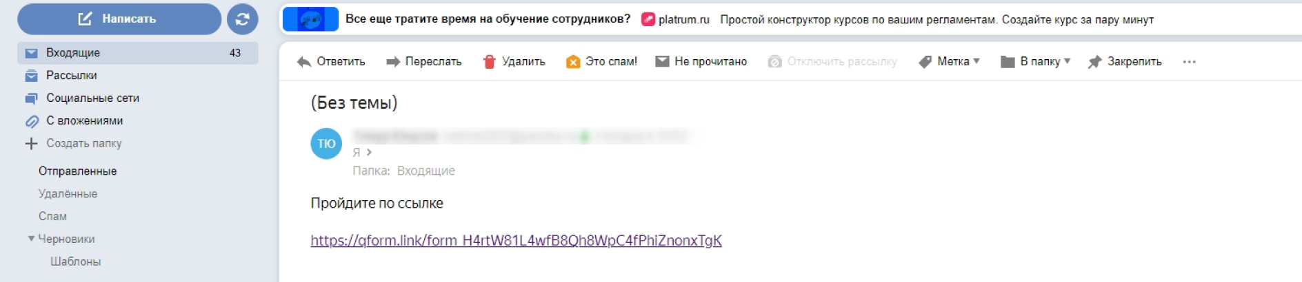 Теперь отправим ссылку по почте и откроем в качестве получателя
