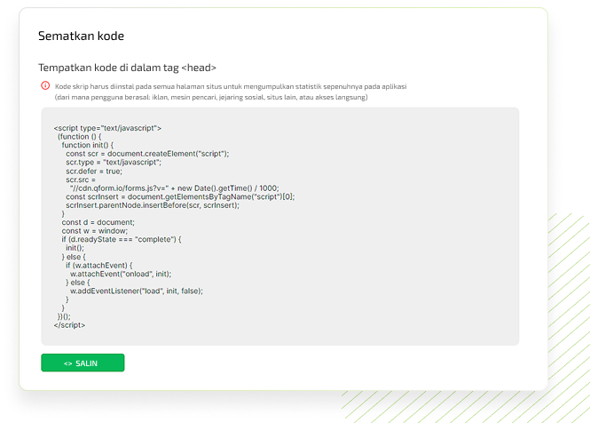 Buka tab "Pengaturan", buka bagian "Sematkan kode", salin skrip dan tempelkan ke situs di dalam tag