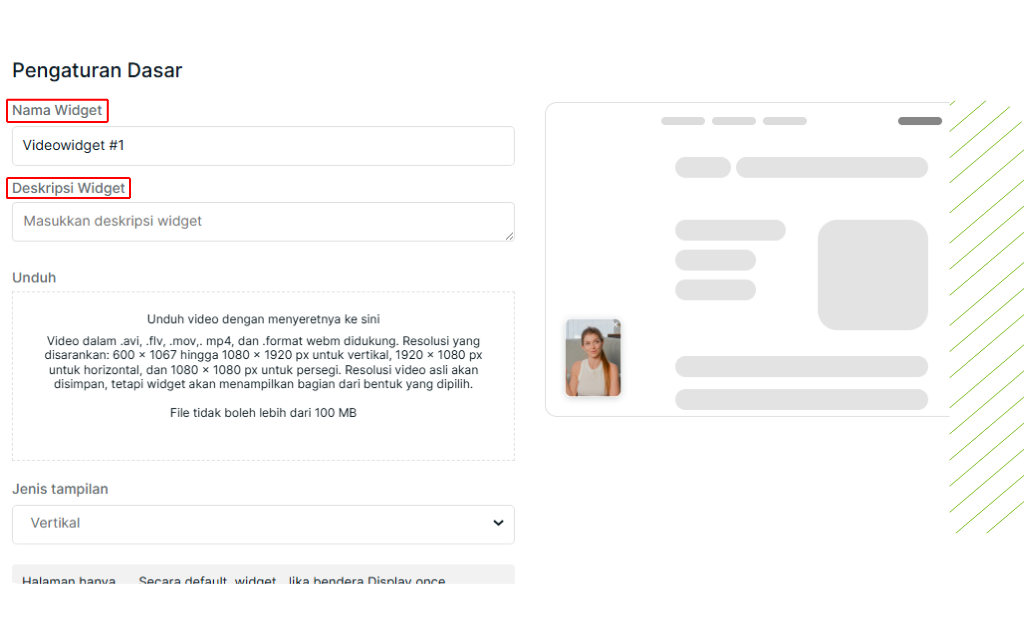 Tentukan nama dan deskripsi widget. Pilih tampilan "Di badan halaman" dengan orientasi yang diinginkan (vertikal, persegi, horizontal).
