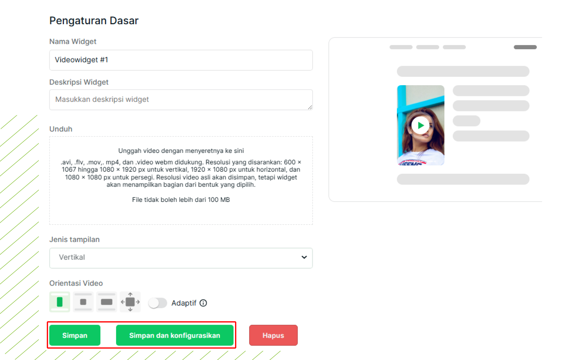 Seret dan lepas file video (format mp4, avi, flv, mov, webm) ke dalam bidang unggah. Pastikan ukuran file tidak melebihi 100 MB.